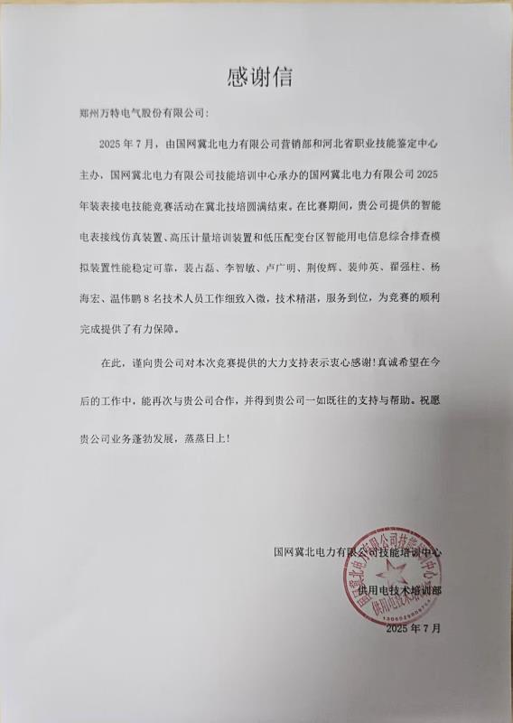 在剛剛結束的國網河南電力裝表接電及反竊電技能競賽和國網冀北電力聯合河北省職業技能鑒定中心主辦的裝表接電賽事中,面對分布式能源安裝、線損分析等復雜場景,公司設備全程穩定運行,為大賽順利進行提供了關鍵技術保障。客戶分別在感謝信中強調,我司派遣的技術人員“細致入微,技術精湛,服務到位”、“堅守崗位,保障賽事零故障”。